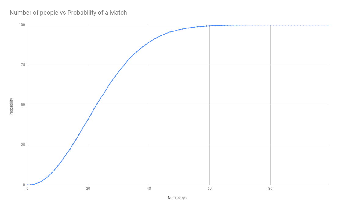 The graph and data below show what the probability is for 0 - 99 people. For each number of people, 10 trials of 10,000 iterations were run and averaged. This data was then plotted as number of people vs probability of a match.